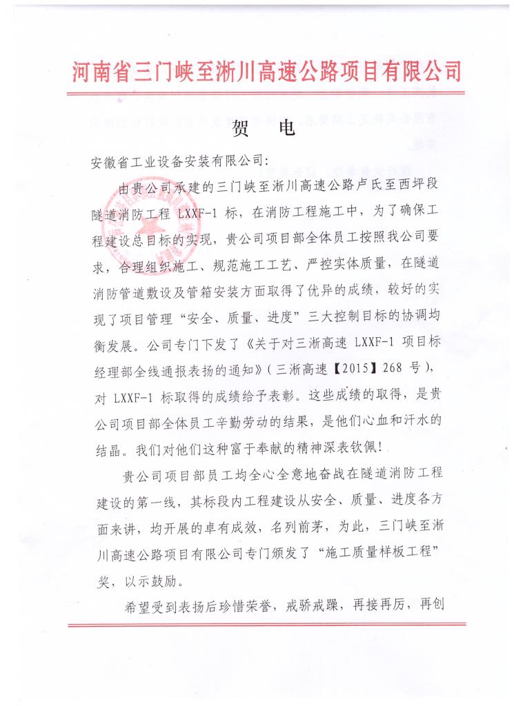 河南省三門峽至淅川高速公路項目有限公司向公司發(fā)來賀電