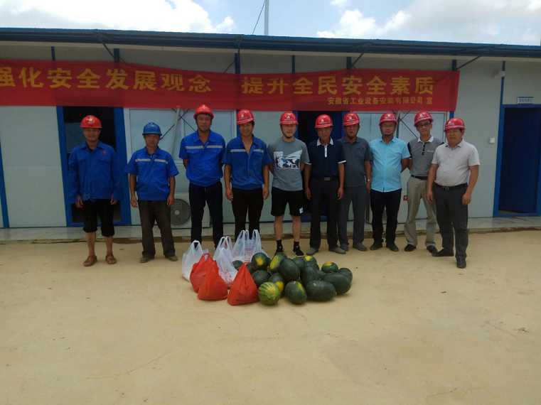 烈日炎炎,酷暑難當,6月28日上午,安裝安裝第四分公司經(jīng)理趙永峰在分公司副經(jīng)理姜田斌,工程科、安全科負責人的陪同下,來到廣東省清遠市印染行業(yè)污水處理項目,看望和慰問奮戰(zhàn)在一線的員工,為他們送去綠豆、白糖、西瓜、藿香正氣水、十滴水、仁丹等防暑降溫物品,實地察看了項目工地和職工生活區(qū),并與項目同志進行了座談交流 。