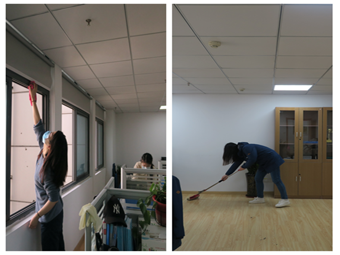 風(fēng)和日麗,大家早早的來(lái)到辦公室,三五一組,相互配合,擼起袖子加油干。開窗通風(fēng)、地面清掃、消毒殺菌、門窗擦拭、書柜整理、綠植澆灌、垃圾傾倒……大家熱情高漲、干勁十足,仔仔細(xì)細(xì)清理著每個(gè)角落,不遺漏任何一個(gè)死角。經(jīng)過(guò)半個(gè)多小時(shí)的辛勤勞動(dòng),辦公區(qū)域頓時(shí)變得更加清新明亮、干凈整潔,不由得令人耳目一新、賞心悅目。隨后,分公司文明衛(wèi)生檢查組還對(duì)各部門的衛(wèi)生情況進(jìn)行了嚴(yán)格打分,并對(duì)檢查結(jié)果進(jìn)行了通報(bào)。
