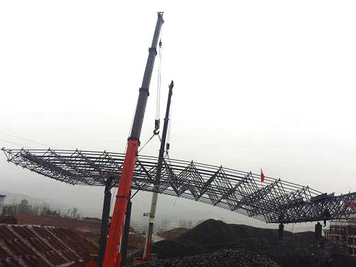 當(dāng)日上午9時(shí)整,隨著吊裝負(fù)責(zé)人一聲令下,一臺(tái)75T汽車吊作為主吊吊起鋼網(wǎng)架一端,兩臺(tái)25T汽車吊做輔吊吊起鋼網(wǎng)架另一端,50噸的大鋼網(wǎng)架徐徐升起,經(jīng)過(guò)調(diào)整、就位、固定,鋼網(wǎng)架終于穩(wěn)穩(wěn)地落在高高的鋼柱上,整個(gè)吊裝過(guò)程歷時(shí)不到1小時(shí)就安全完成。吊裝的科學(xué)合理安排、進(jìn)展的有序組織得到業(yè)主和監(jiān)理的贊許。
