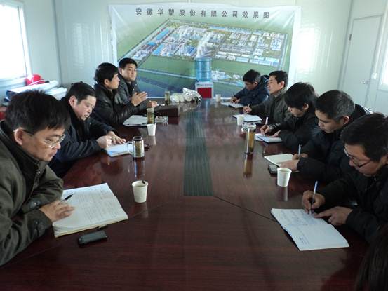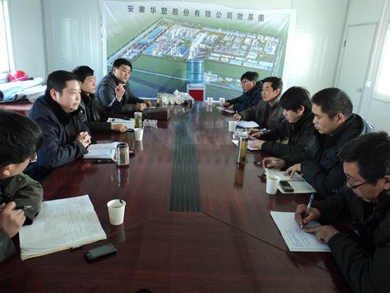 王總一行首先聽取了安徽華塑項(xiàng)目部關(guān)于質(zhì)量、安全文明、施工進(jìn)度、工作目標(biāo)和下一步工作計(jì)劃的匯報(bào)。王總一行對(duì)安徽華塑項(xiàng)目部在開工短短兩個(gè)月內(nèi)取得的成績給予充分肯定。王總特別指出,在工期緊、任務(wù)重、困難大的情況下,項(xiàng)目部一定要思想上重視,制定科學(xué)合理的方案,與施工各方進(jìn)行高效溝通,搶工期、保質(zhì)量、展風(fēng)采,為后續(xù)工程的承接創(chuàng)造有利條件。